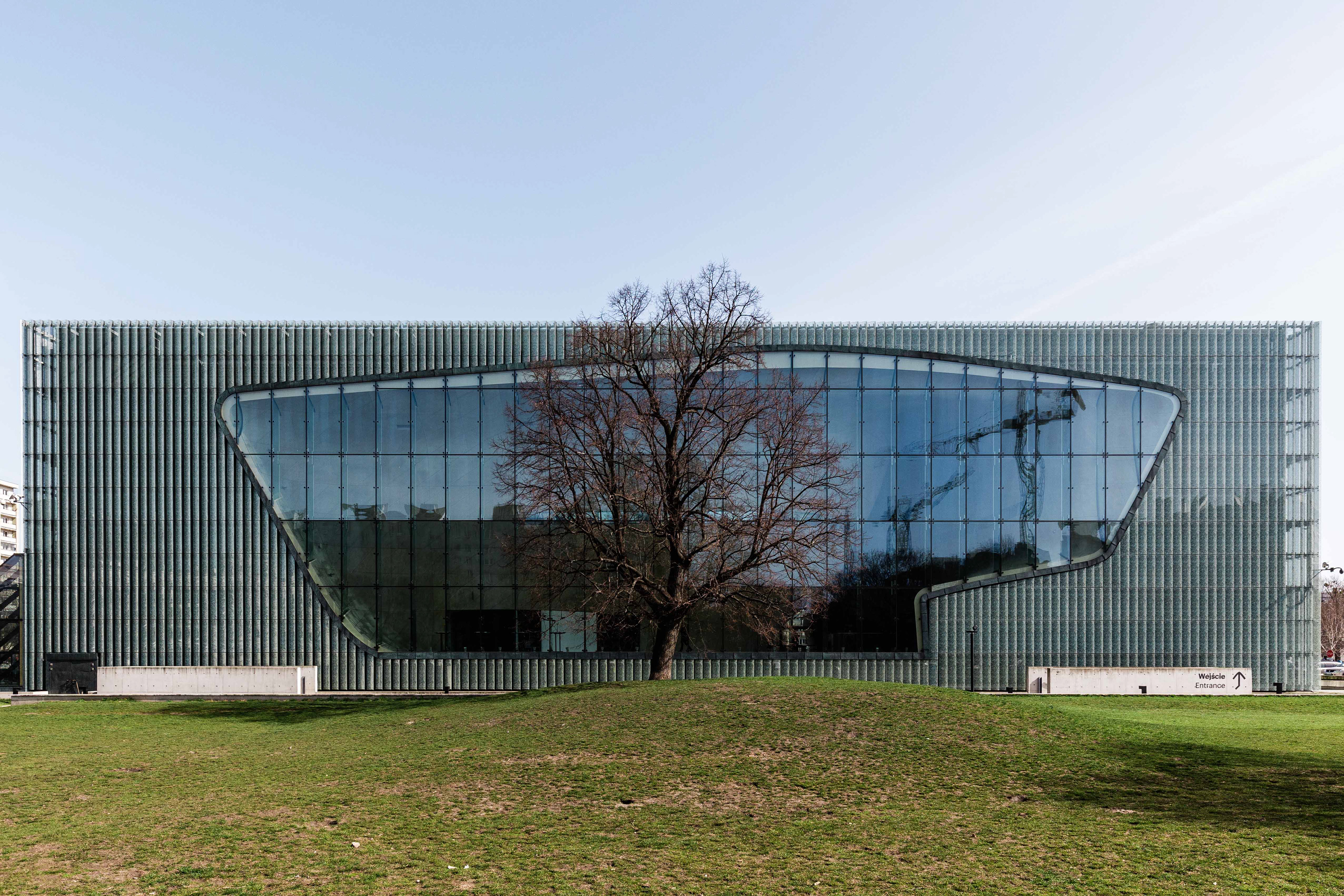 Muzeum Historii Żydów Polskich POLIN Projekt: Lahdelma & Mahlamäki Architects; R. Mahlamäki współpraca; Kuryłowicz & Associates Za stroną https://www.nagroda-architektoniczna.pl/winners/muzeum-historii-zydow-polskich-polin/ : "Budynek muzeum powstał w symbolicznym miejscu: w sercu dawnej tętniącej życiem dzielnicy zamieszkałej przez Żydów, w czasie wojny przekształconej przez Niemców w getto. Od 1948 roku wznosi się tu pomnik Bohaterów Getta autorstwa Natana Rapaporta. Plan, na którym wzniesiono budynek znajduje się między muranowskimi budynkami mieszkalnymi, wzniesionymi w okresie powojennym. Stworzenie koncepcji architektonicznej budynku w takiej lokalizacji i opowiadającego o tysiącu lat historii nie było łatwym zadaniem. Projekt budynku autorstwa fińskiego studia architektonicznego Lahdelma & Mahlamäki został wyłoniony w 2005 roku w międzynarodowym konkursie architektonicznym pod przewodnictwem Bohdana Paczowskiego. W konkursie, na który napłynęło ponad 100 zgłoszeń z całego świata, wzięli udział znakomici architekci, m.in. Zvi Hecker, Kengo Kuma czy Daniel Libeskind. Jury doceniło projekt autorstwa Rainera Mahlamäkiego między innymi za powściągliwość i umiar, z jakimi potraktował niedawną historię polskich Żydów. Mahlamäki zaproponował budynek, który z zewnątrz ma spokojne, geometryczne kształty, ale zaskakuje niezwykłym wnętrzem. Dynamiczne, dające złudzenie falowania, ściany holu przecinają budynek od wschodniej do zachodniej fasady. To pęknięcie odzwierciedla wyrwę w tysiącletniej historii polskich Żydów. Jednocześnie monumentalny hol zalany światłem padającym przez ogromne okno i widok na park przypominają, że ta historia nie została zamknięta, a Muzeum POLIN jest muzeum życia. Jest też łącznikiem między przeszłością a teraźniejszością i przyszłością – co symbolizuje mostek spinający obie ściany holu. Symbolika muzeum nie ogranicza się do wnętrza: fasadę budynku zdobią szklane panele, na których litery hebrajskie i łacińskie układają się w słowo "Polin" – przypominające legendę o przybyciu Żydów do Polski i będące nazwą muzeum. Fiński architekt mocno osadził swój projekt w otoczeniu. Muzeum zostało skonstruowane na planie kwadratu, który przylega do identycznego kwadratu placu przy pomniku Bohaterów Getta. Sama bryła budynku również powtarza kształty okolicznych domów i pomnika. Jednak między monumentem a budynkiem muzeum toczy się dialog: pomnik jest miejscem refleksji i upamiętniania tych, którzy zginęli, zaś muzeum miejscem odkrywania historii żydowskiego życia w Polsce."